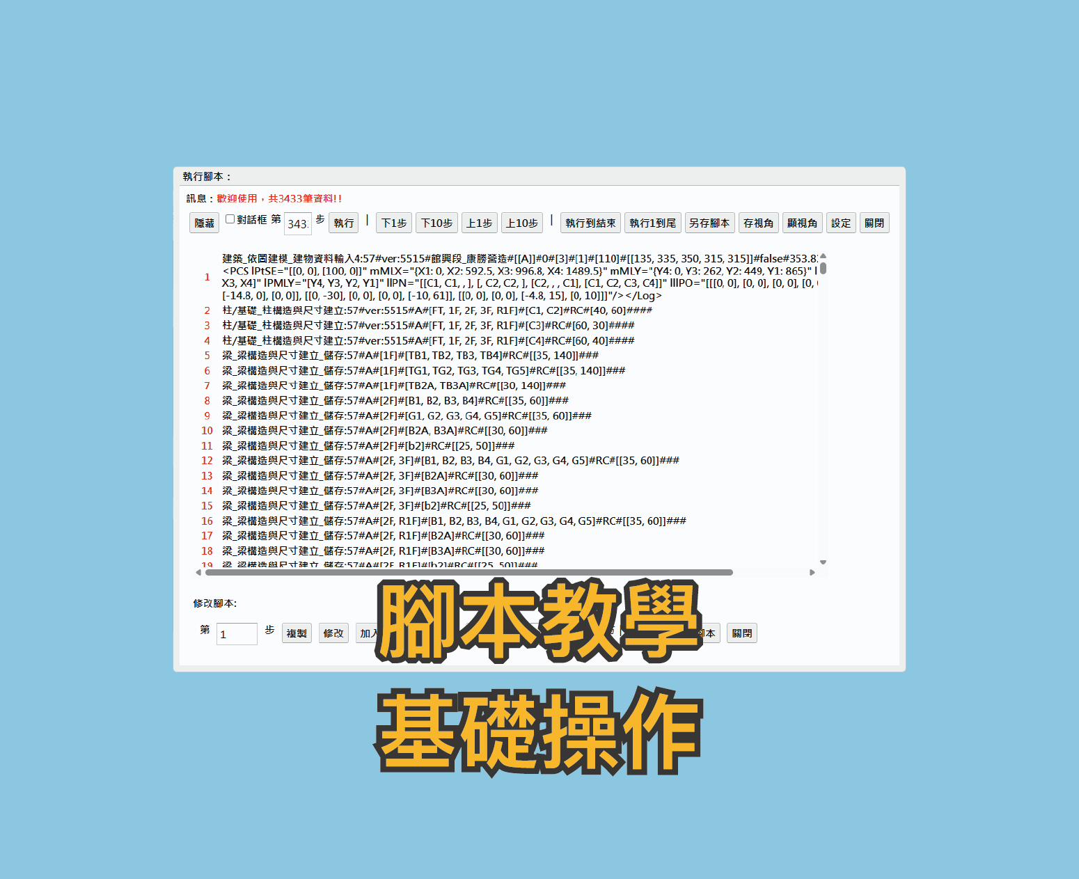 教學項目:執行腳本案件名稱:47. 館盛用途:透天構造:RC造規模:地上3,屋突1說明:腳本功能介紹與操作方式