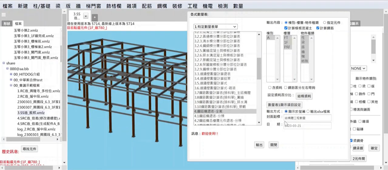 使用功能:鋼構部件設定及數量估算案件名稱:41. 振基使用用途: 工廠構造種類:SS 造建築規模:地上1說明:部件設定及數量表輸出